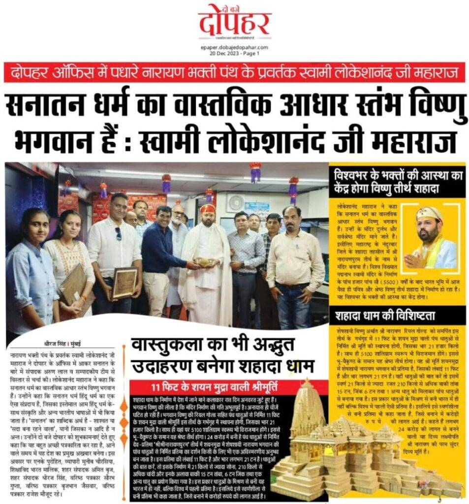 मुंबई ,fort नारायण भक्ती पंथ के प्रवर्तक स्वामी लोकेशानंद जी महाराज ने दोपहर के ऑफिस में आकर सनातन के बारे में संपादक अरुण लाल व संपादकीय टीम से विस्तार से चर्चा की। उन्होंने शुभकामनाएं देते हुए कहा कि यह बहुत अच्छी पत्रकारिता कर रहा है, आने वाले समय में यह देश का प्रमुख अखबार बनेगा। इस अवसर पर एन.के पुरोहित, व्यापारी मुनीब चौरसिया, शिक्षाविद भरत मालिक, शहर संपादक अमित बृज, शहर संपादक धीरज सिंह, वरिष्ठ पत्रकार सौरभ गुप्ता, वरिष्ठ पत्रकार बृजभान जैसवार, वरिष्ठ पत्रकार राजेश मौजूद रहे।